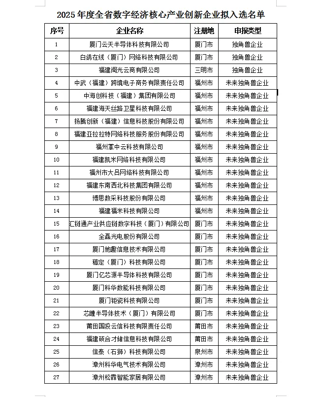 为深入实施做大做强做优数字经济行动计划,加快培育壮大数字经济创新企业,经企业申报、专家核验等程序,省数据管理局初步确定2025年度福建省数字经济核心产业创新企业拟入选名单,现予以公示。