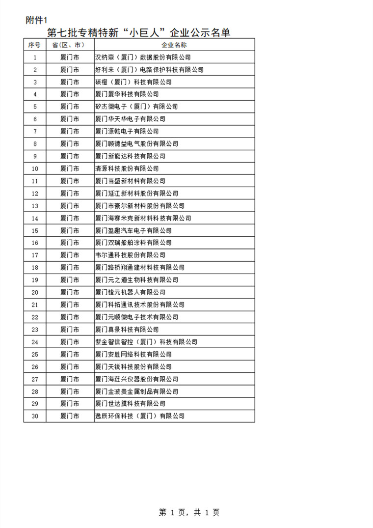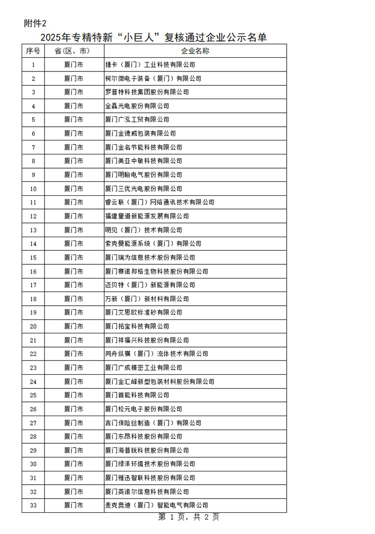 为深入贯彻习近平总书记关于激发涌现更多专精特新中小企业的重要指示批示精神,工业和信息化部开展了2025年专精特新“小巨人”企业认定和复核工作,已完成相关审核,现将厦门市通过审核的企业名单予以公示(见附件1、2)。