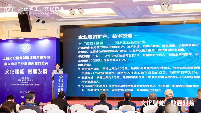12月26日下午,由买球官网手机版·(中国)官方网站 主办、中国农业银行股份有限公司厦门市分行协办的“工业文化赋能制造业高质量发展暨大中小企业融通创新对接会”在厦门成功举办。