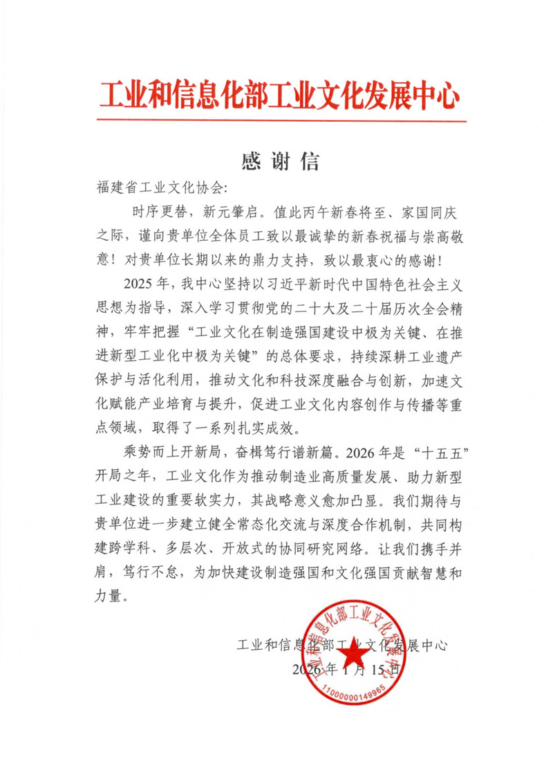 近日,买球官网手机版·(中国)官方网站 (以下简称协会)收到工业和信息化部工业文化发展中心发来的感谢信。信中对协会长期以来的鼎力支持致以衷心的感谢,并向协会全体同仁致以诚挚的新春祝福。