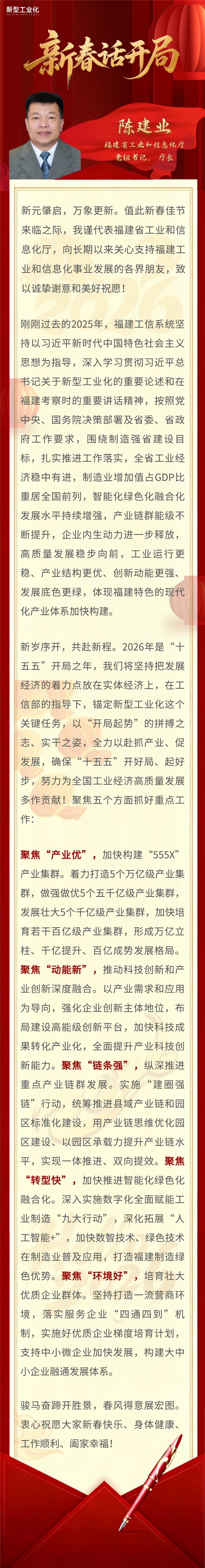 辞旧迎新,烟火年年。在丙午马年春节到来之际,在“十五五”开局之年,工业和信息化部机关刊《新型工业化》全媒体特别策划推出“地方工信新春话开局”专题,邀请地方工信主管部门主要负责同志介绍所在地区2025年取得的成绩,畅谈2026年推进新型工业化的新战略、新思路、新举措,并为读者送出美好祝福。