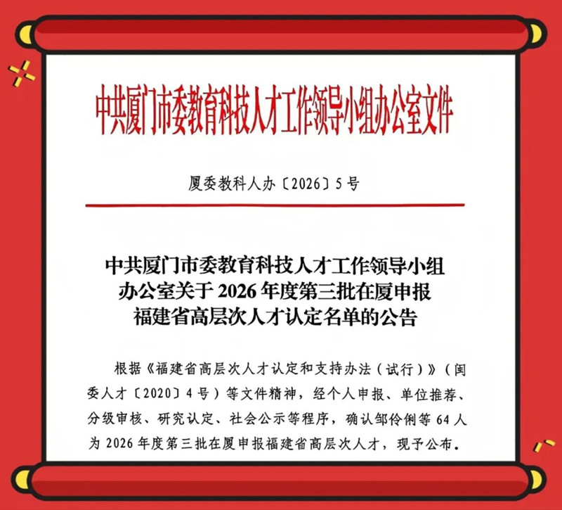近日,中共厦门市委教育科技人才工作领导小组办公室发布《厦委教科人办〔2026〕5号》文件,协会副会长、厦门市铂联科技股份有限公司吴永进等三位核心管理者凭借卓越的产业贡献与创新能力,成功入选2026年度第三批福建省高层次人才认定名单。